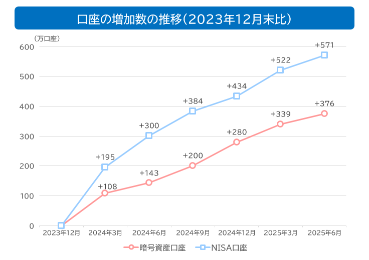 NISA口座は1年半で571万口座増加しました。他方、暗号資産口座はこの間に376万口座増加しています。数字だけを見ると約200万口座の増加数の差がありますが、暗号資産の口座数も相当な伸びを見せていると感じた人もいるのではないでしょうか(※)。
