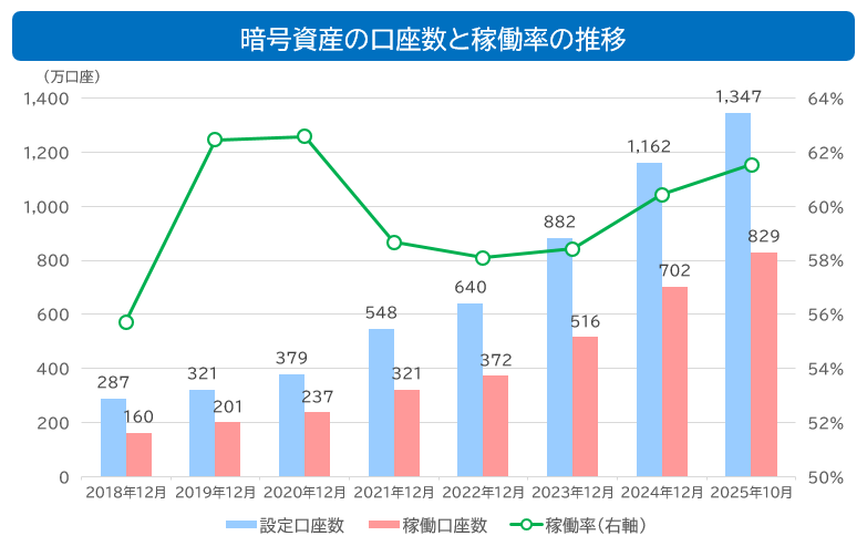 国内における暗号資産の保有者は拡大を続けており、JVCEAのデータによると2025年10月末時点で口座数は延べ1,347万口座(法人口座含む)に達しています。これは、日本の人口で単純に割ると約10人に1人が口座を保有している計算になります(※)。