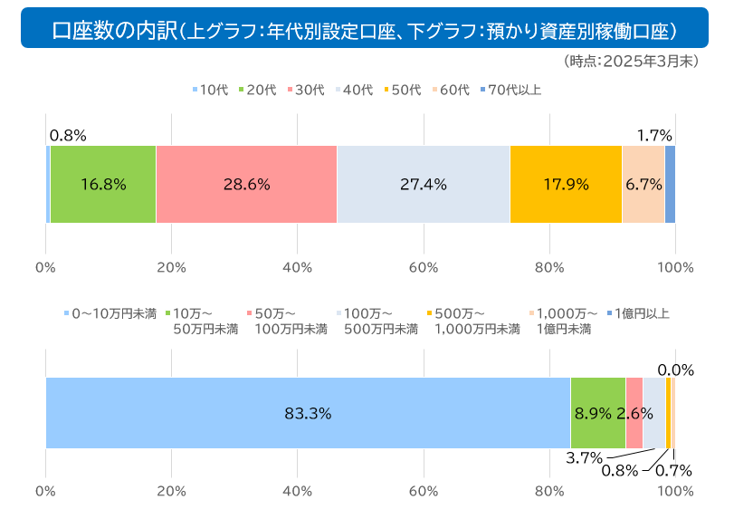 また、預かり資産別では「0~10万円未満」の口座が最も多く、稼働口座全体の83.3%を占めています。(【図表3・下グラフ】)