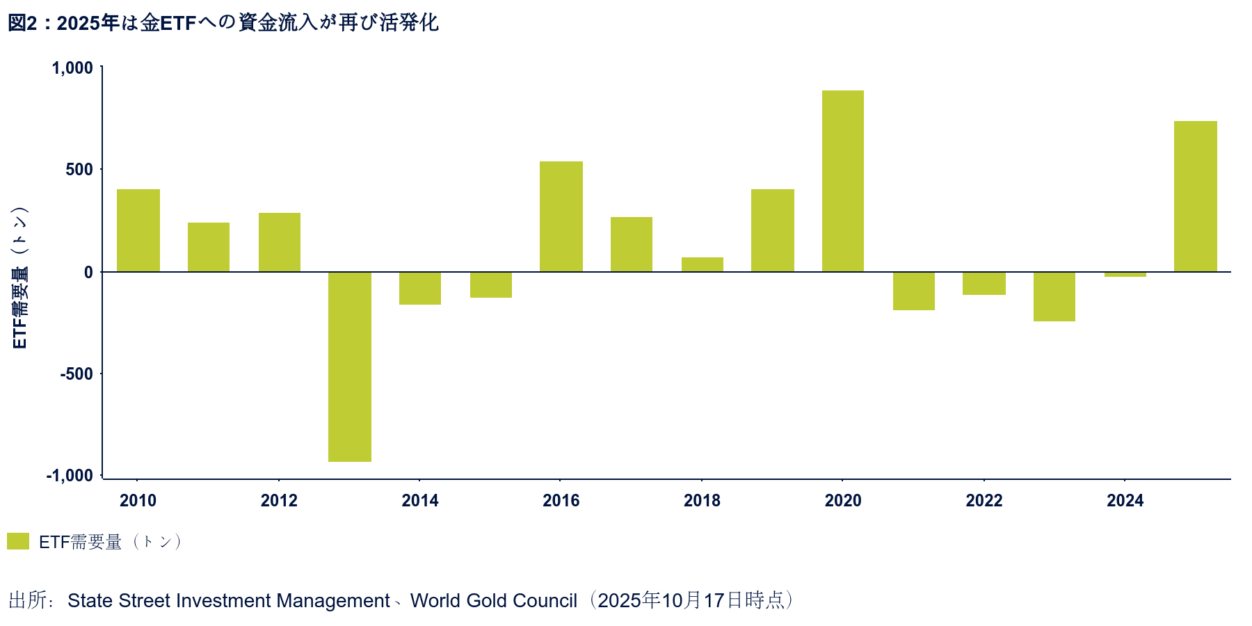 2025年通年の買い入れは、年間約1,000トンという近年のトレンドには届かない可能性があるものの、依然として過去最高水準に迫る力強い需要が見込まれます。ETFへの資金流入も引き続き力強く、年初来の流入額は米ドルベースで2020年通年の記録をすでに上回り、トン数ベースでも2020年にほぼ匹敵する水準となっています(図2)。