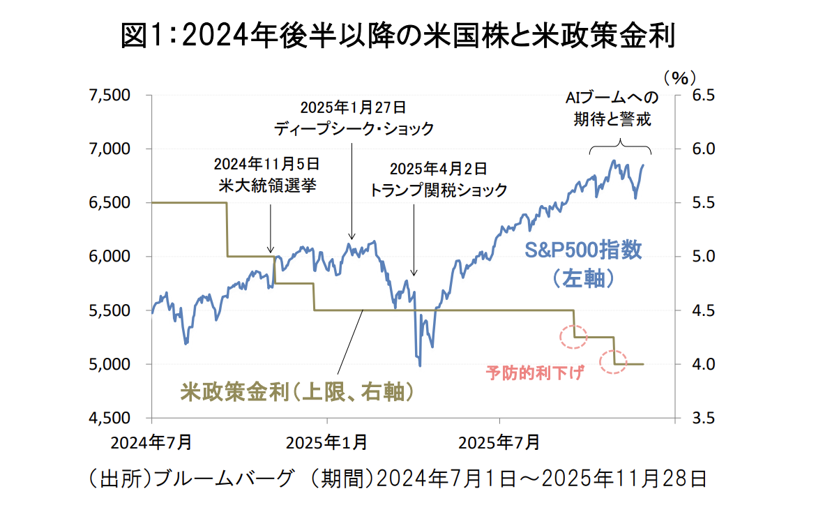2025年の米国株式市場を振り返ると、1月のディープシーク・ショックや4月のトランプ関税ショックを受けて、AI投資やトランプ政権の政策をめぐる不透明感が高まり、年前半は相場変動の激しい展開となりました(図1)。しかし、年後半に入ると、主要国との関税交渉の進展によってトランプ政策の不透明感が後退し、米国株は安定した上昇基調を取り戻しました。米連邦準備制度理事会(FRB)が9月と10月に予防的利下げを決定したことも、株式相場を下支えしました。