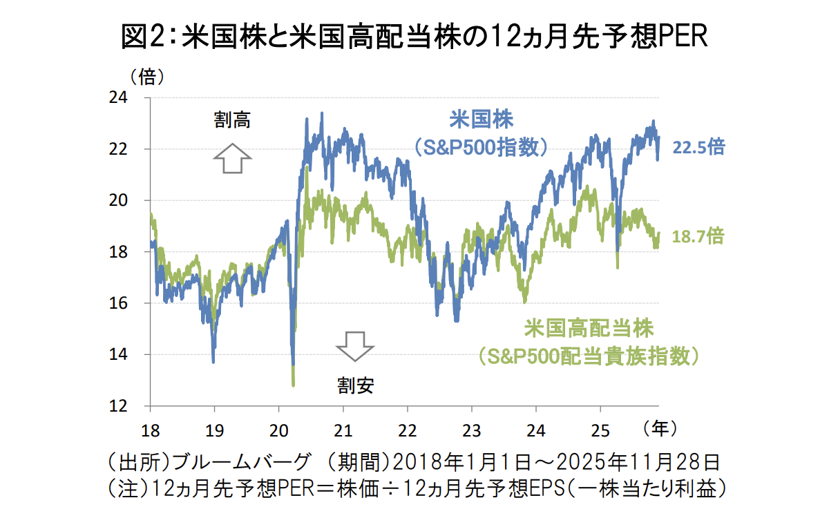 2025年後半には米国株が史上最高値を更新する中、AIブームへの期待と警戒が交錯していることが株価の上値を抑える要因として浮上しています。米国株の12ヵ月先予想PER(株価収益率)が一時、2020年9月以来となる23倍台まで上昇し、株価の割高感が高まりつつあることも、AI関連のハイテク株への過熱懸念を高める一因として考えられます(図2)。一方、米国株の中でも米国高配当株の予想PERは19倍前後に留まり、割高感は限定的となっています。ポートフォリオのハイテク株への集中リスクを抑える観点から、高配当株への分散投資を検討する余地がありそうです。