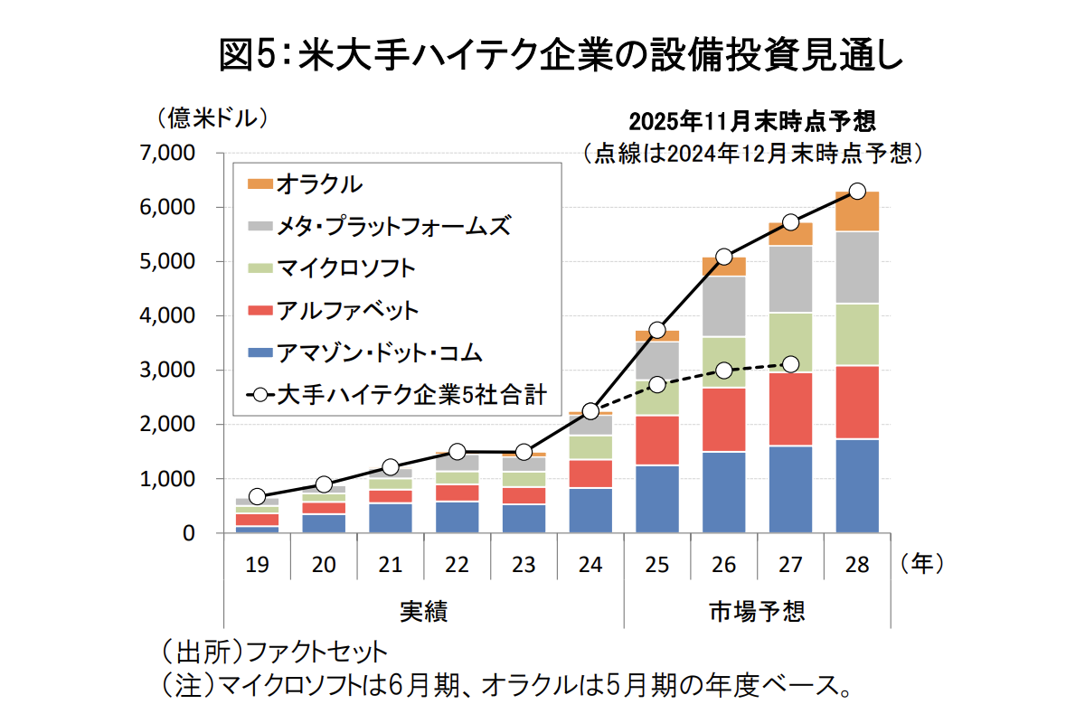 2026年の米国株は、堅調な企業業績が株価の上昇を下支えすることが見込まれます。米国企業の純利益は、2025年の前年比+12.4%予想に続き、2026年も同+14.2%と二桁の伸びが期待されています(図4)。また、2026年以降はハイテク・セクターの利益成長が徐々にピークアウトする一方、非ハイテク・セクターの利益成長が米国企業の業績のけん引役として浮上すると考えられます。こうした業績環境の下では、2026年はハイテク・セクターから幅広いセクターへの分散投資が進む可能性がありそうです。