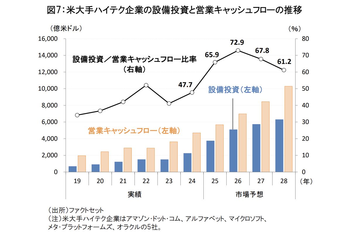 特にAIブームの恩恵を受けるハイテク・セクターでは、2026年も大手企業による大規模なAI関連の設備投資が継続すると見込まれます(図5)。一方、足元の市場では、拡大する設備投資に見合う利益をハイテク企業が生み出しているかに焦点が集まるなど、ハイテク・セクターに対する投資家の目線は一段と厳しさを増しています。ハイテク・セクター全体では2026年以降も設備投資を上回る堅調なキャッシュフローの拡大が期待されているものの、利益成長やバランスシートの健全性などに応じて銘柄選別が進む可能性があります(図7)。