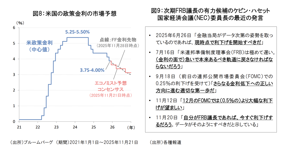 一方、金融環境の面では、米連邦準備制度理事会(FRB)が予防的利下げを継続すれば、米国株にとって追い風になると期待されます。現状の市場予想では、米政策金利は2026年末には3.00~3.25%程度まで引き下げられるとの見方が大勢となっています(図8)。また、2026年5月に就任予定の次期FRB議長の有力候補として、国家経済会議(NEC)委員長のケビン・ハセット氏が浮上しており、ハト派的とされるハセット氏の政策スタンスも利下げを後押しする可能性があります(図9)。