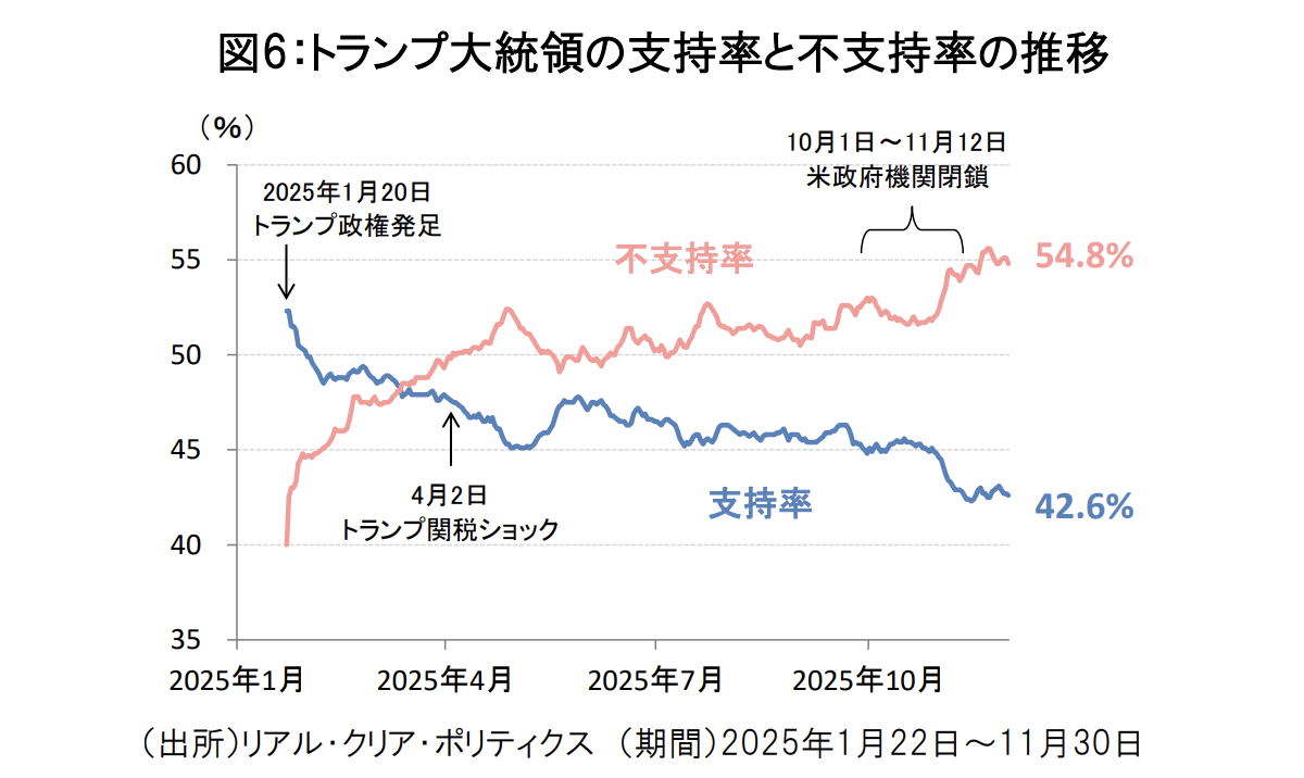 最後に、今後のリスクとしては、足元の米株高にもかかわらずトランプ大統領の支持率が低下傾向にあり、2026年の中間選挙に向けてトランプ政権の財政規律が悪化に向かうかを慎重に見極める必要がありそうです(図6)。