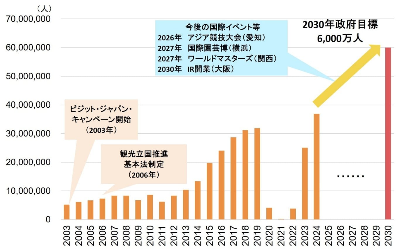 訪日観光客数はコロナ禍で急減しましたが、現在では回復し2024年は約3,600万人と過去最高を記録しました。日本政府は2030年に訪日観光客数6,000万人の目標を掲げています。政府はインバウンドを成長戦略の柱として、「持続可能な観光」「消費額拡大」「地方誘客促進」などに戦略的に取り組んでいます。今後開催される国際イベントなどを契機として、更なる訪日外国人の増加につながることが期待されます。