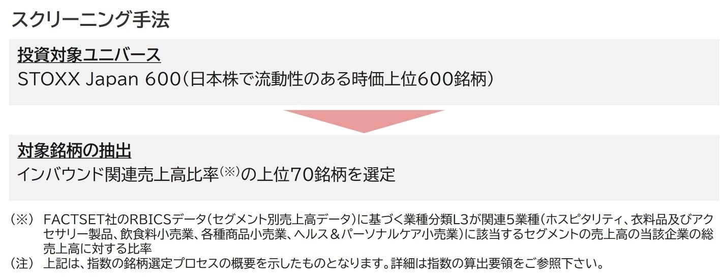 | 対象指標の概要 | 「iSTOXX MUTB ジャパンインバウンド インデックス(ネットリターン)」について ・構成銘柄は、日本株で流動性のある時価上位600銘柄である「STOXX JAPAN 600」から選定されます。 ・「STOXX JAPAN 600」の構成銘柄から、インバウンド関連売上高比率(※)の高い上位70銘柄を選定します。 (※)ホスピタリティ、衣料品及びアクセサリー製品、飲食料小売業、各種商品小売業及びヘルス&パーソナルケア小売業のセグメントに対する売上高比率 ・年2回(6月、12月)、構成銘柄の見直しが行われます。 |