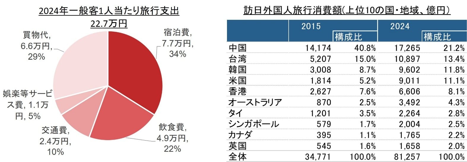 訪日外国人旅行消費額は2015年から2024年にかけて3.4兆円から8.1兆円へ約2.3倍(年平均10%)と大きく増加しました。更に、政府は2030年に訪日外国人消費額15兆円の目標を掲げています。国・地域別にみると、中国が1.7兆円と最も多く、次いで台湾、韓国の順となりますが、上位3国・地域の構成比は64%から47%に減少し、多様化が進んでいます。