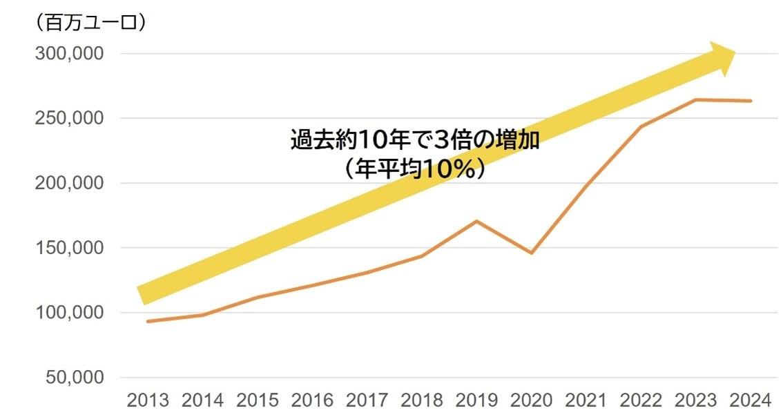 ヨーロッパのラグジュアリー企業10社の売上高はコロナ禍において一時減少していましたが、近年増加傾向にあり、2013年~2024年では売上高が約3倍に増加しました。地域別ではアジアの比率が高く、企業の成長をけん引しています。