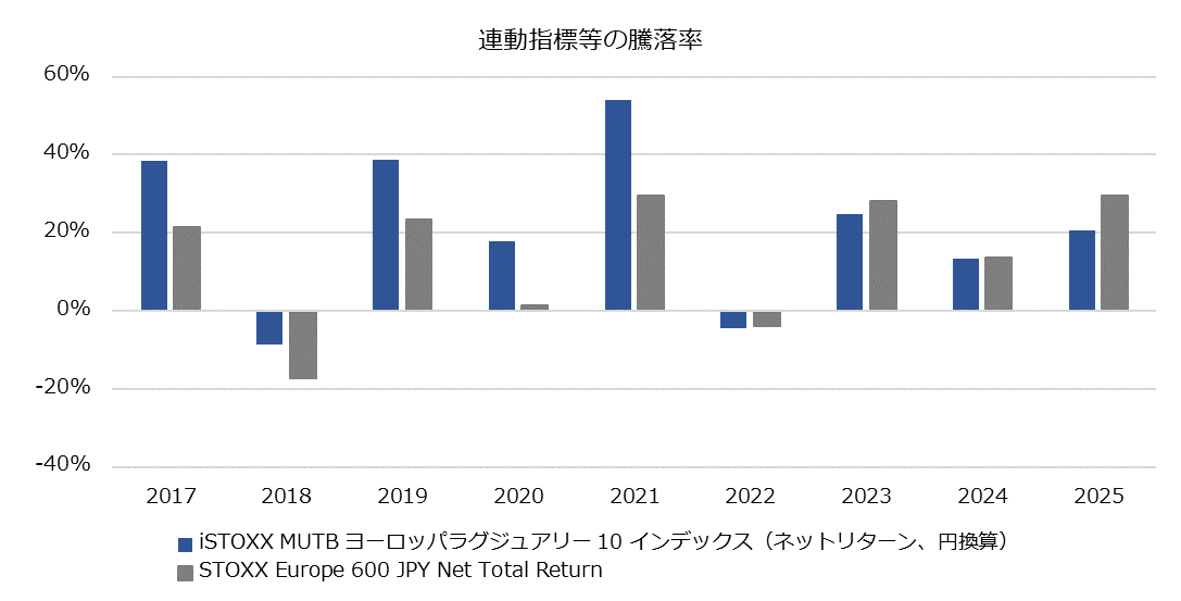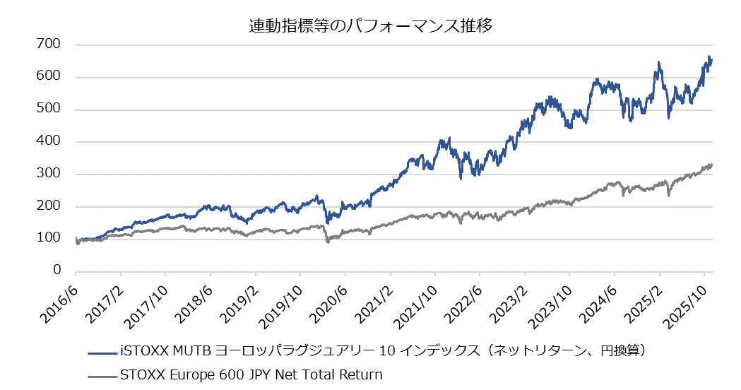 | 対象指標 | iSTOXX MUTB ヨーロッパラグジュアリー 10 インデックス(ネットリターン、円換算) | ||||