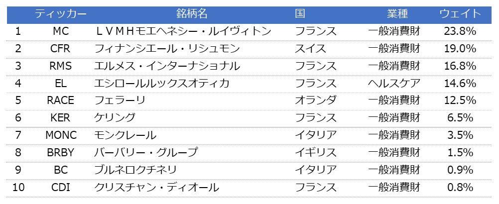 本ETNの連動対象指標であるiSTOXX MUTB ヨーロッパラグジュアリー 10 インデックスは、ヨーロッパの時価総額上位企業の中から、ラグジュアリー関連業種に該当し、かつ、ラグジュアリー関連売上が一定比率を超える銘柄を10銘柄選定し、算出されます。