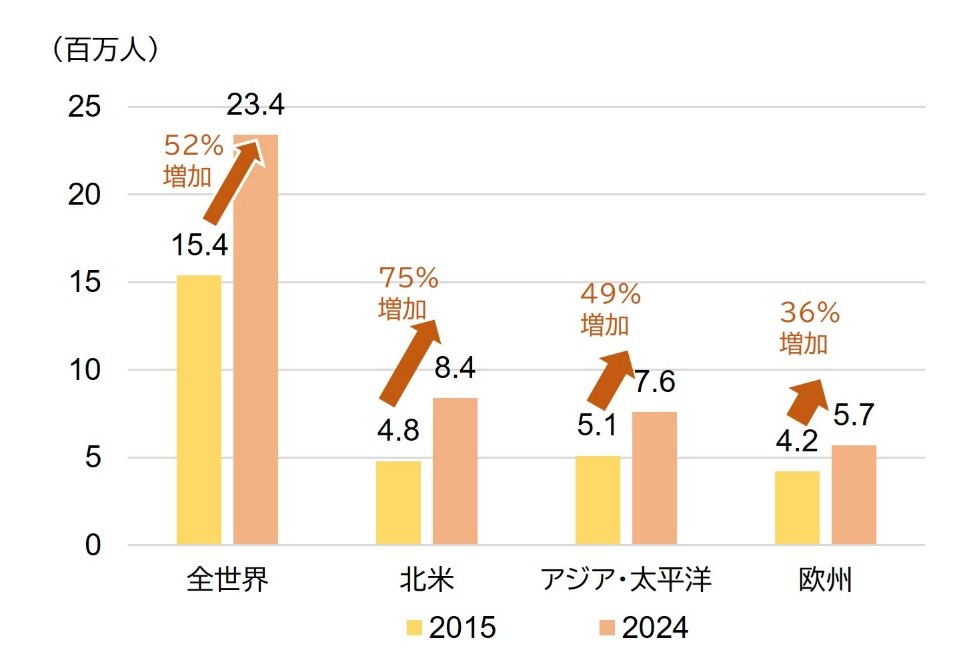 中国・インドを中心とするアジア地域などの世界経済の成長により、世界の富裕層人口は2015年~2024年に約800万人増加しています。富裕層を含めた高級ブランド商品の消費者層が拡大することで、高級ブランドに対する需要が高まり、ラグジュアリー企業の業績が中長期的に拡大することが期待されます。