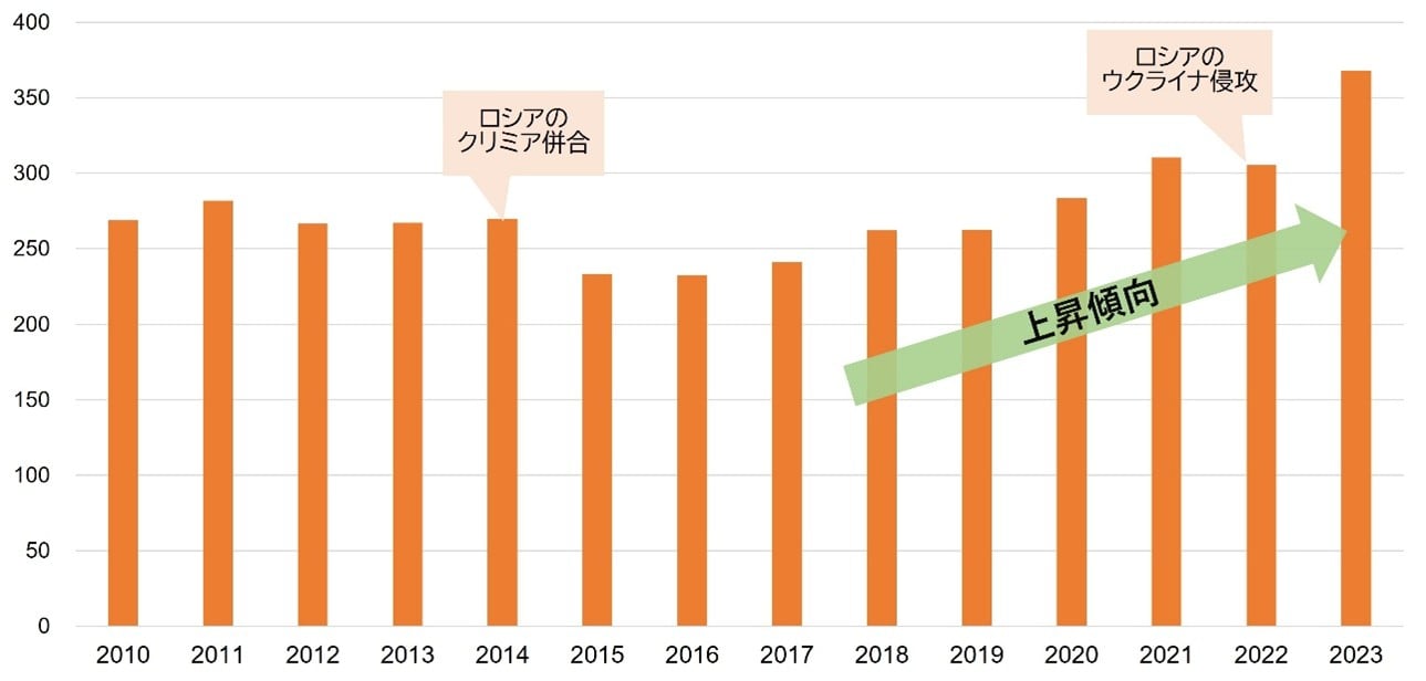 欧州主要国の軍事費用推移(単位:10億米ドル)(注)