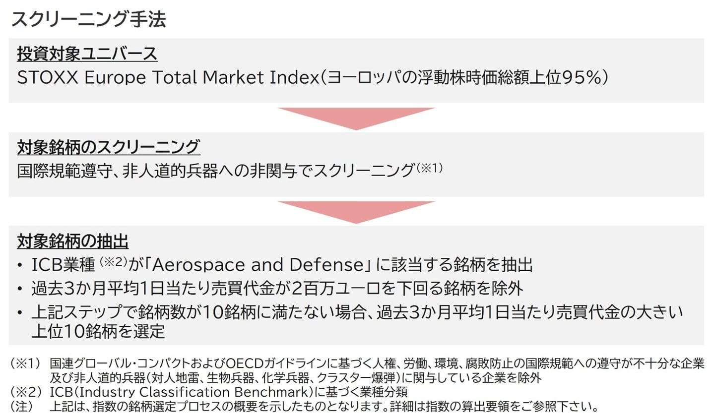 | 対象指標の概要 | 「iSTOXX MUTB ヨーロッパ航空宇宙防衛 インデックス(ネットリターン、円換算)」について ・構成銘柄は、ヨーロッパ地域の浮動株時価総額上位95%である「STOXX Europe Total Market」から選定されます。 ・「STOXX Europe Total Market」の構成銘柄から、国際規範遵守・非人道兵器への非関与のスクリーニングを経たうえで、航空宇宙および防衛業(※)に該当する流動性の高い銘柄を選定します。 (※)ICB(Industry Classification Benchmark)の業種分類 ・年4回(3月、6月、9月、12月)、構成銘柄の見直しが行われます。 |