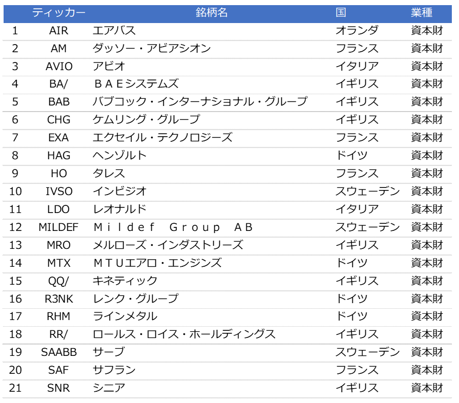本ETNの連動対象指標であるiSTOXX MUTB ヨーロッパ航空宇宙防衛 インデックスは、ヨーロッパの時価総額上位企業の中から、国際規範遵守・非人道的兵器への非関与でスクリーニングしたうえで、「航空宇宙・防衛」業種に該当し、流動性基準を満たす銘柄を選定して算出されます。