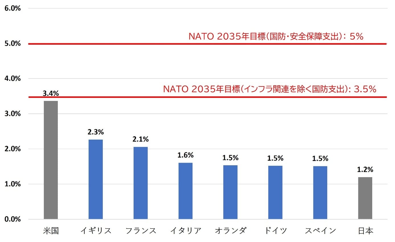 ウクライナ戦争勃発後、米国は巨額の支援を行っていましたが、戦争は長期化。第二次トランプ政権となった米国は欧州諸国に防衛費増額の要求を強く行いました。これを受け、NATO(北大西洋条約機構)は2025年、2035までに防衛費支出の対GDP比を5%に引き上げる目標を承認。これにより、欧州の防衛関連企業への注目が高まっています。