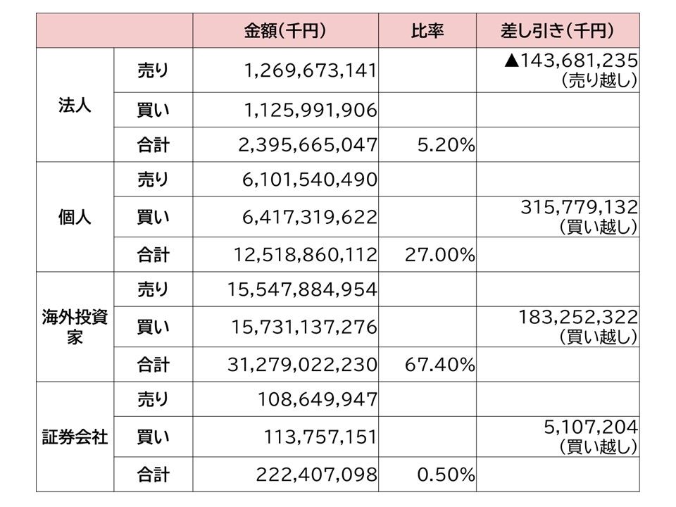 差し引きは買い金額から売り金額を差し引いたもので、プラスは買い越し、マイナスは売り越しを意味します。*5