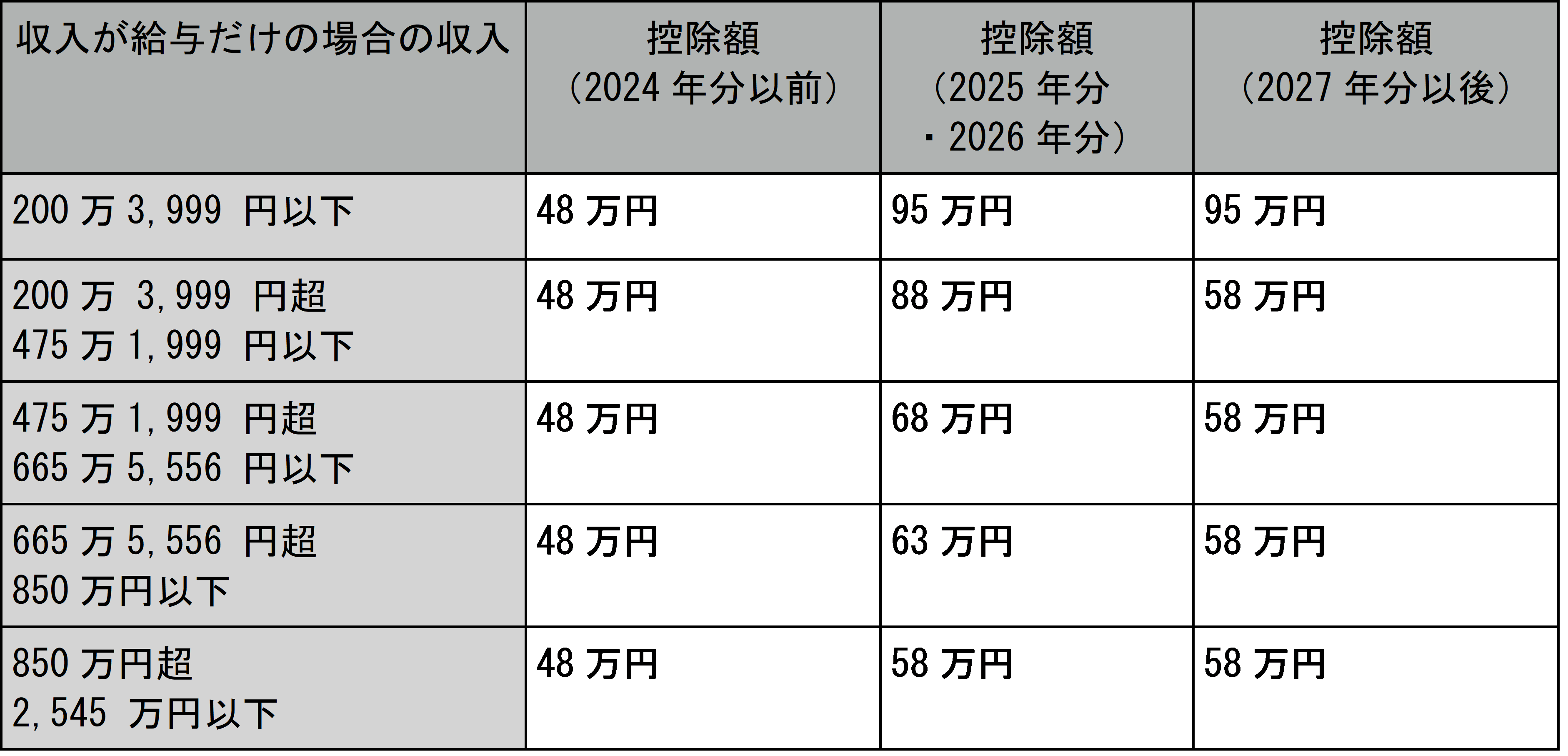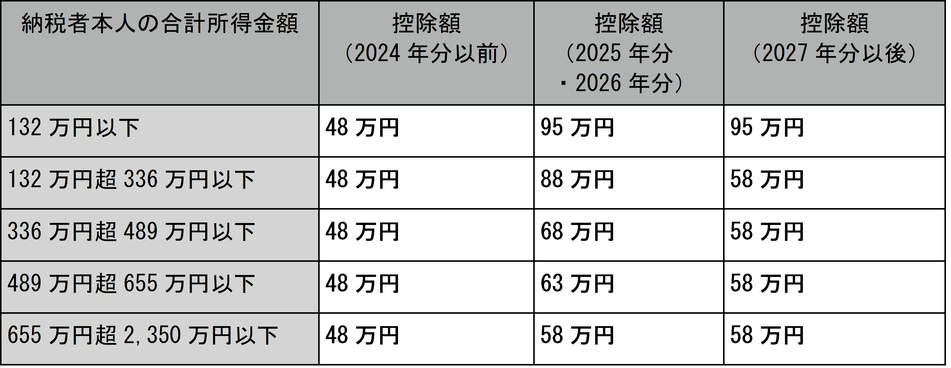 なお、2027年以降、合計所得金額「132万円超2,350万円以下」の控除額は一律で「58万円」です。