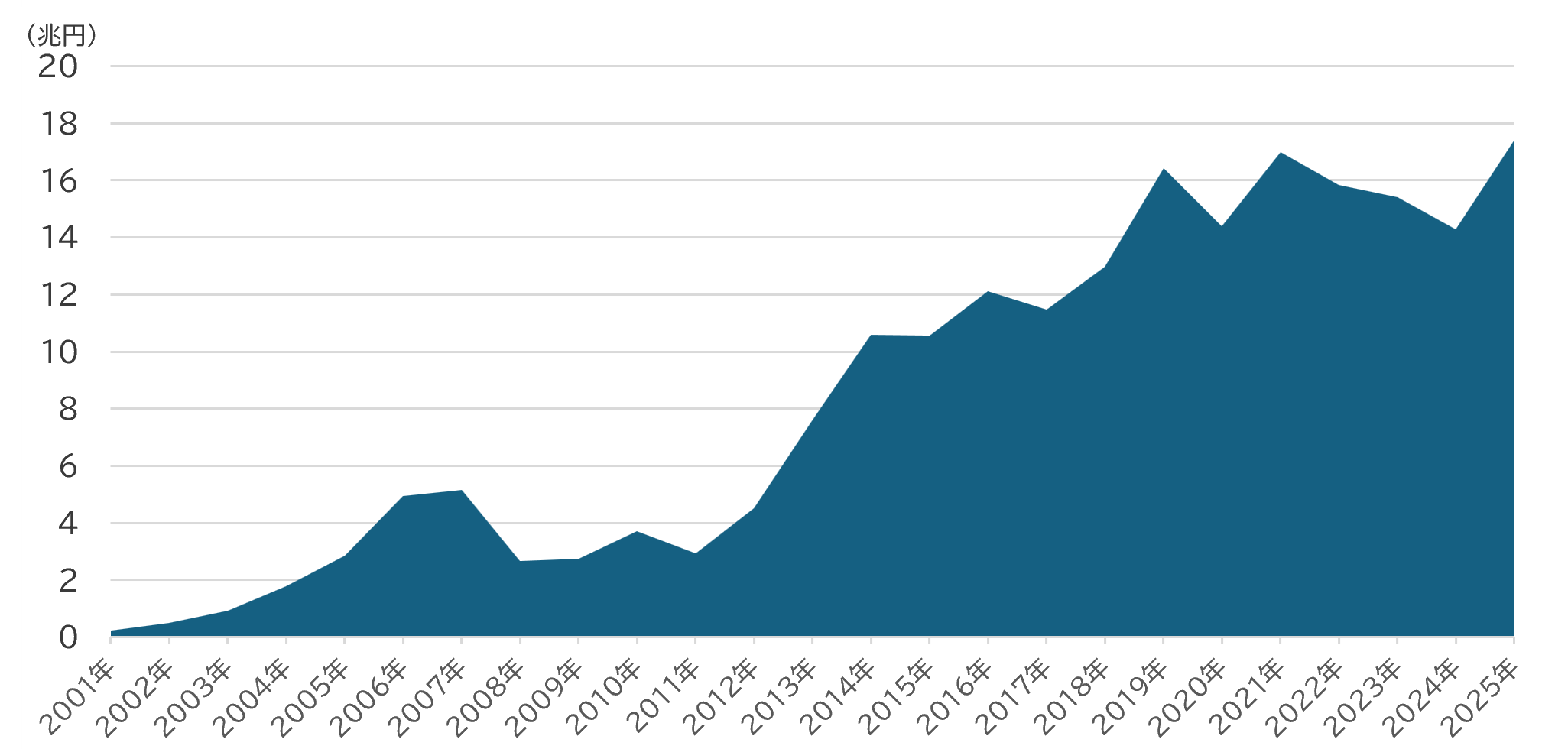 Jリート市場の時価総額の推移 (2001年12月末~2025年12月末、各年月末時点)