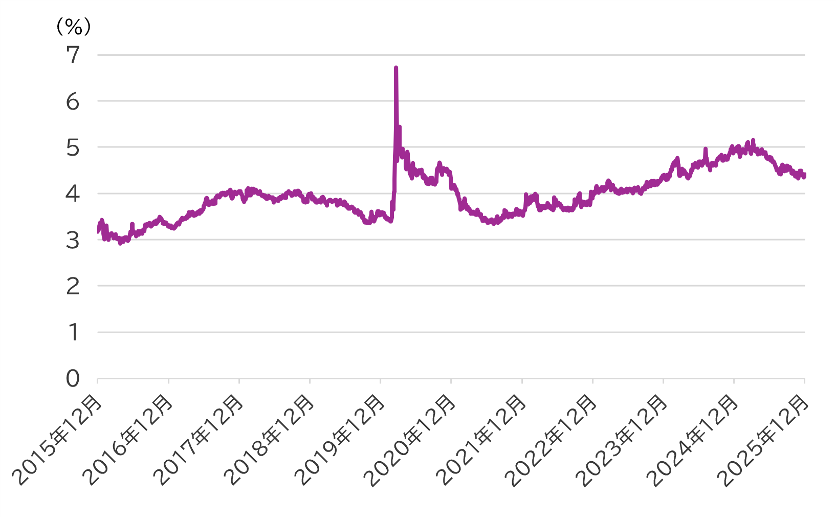 2025年12月末時点の東証REIT指数の利回りは4.4%程度であり、過去10年間の東証REIT指数の利回りの推移をみると、コロナショック時の相場急変時を除いても、おおよそ3~4%台程度の比較的高い利回り水準が維持されています。