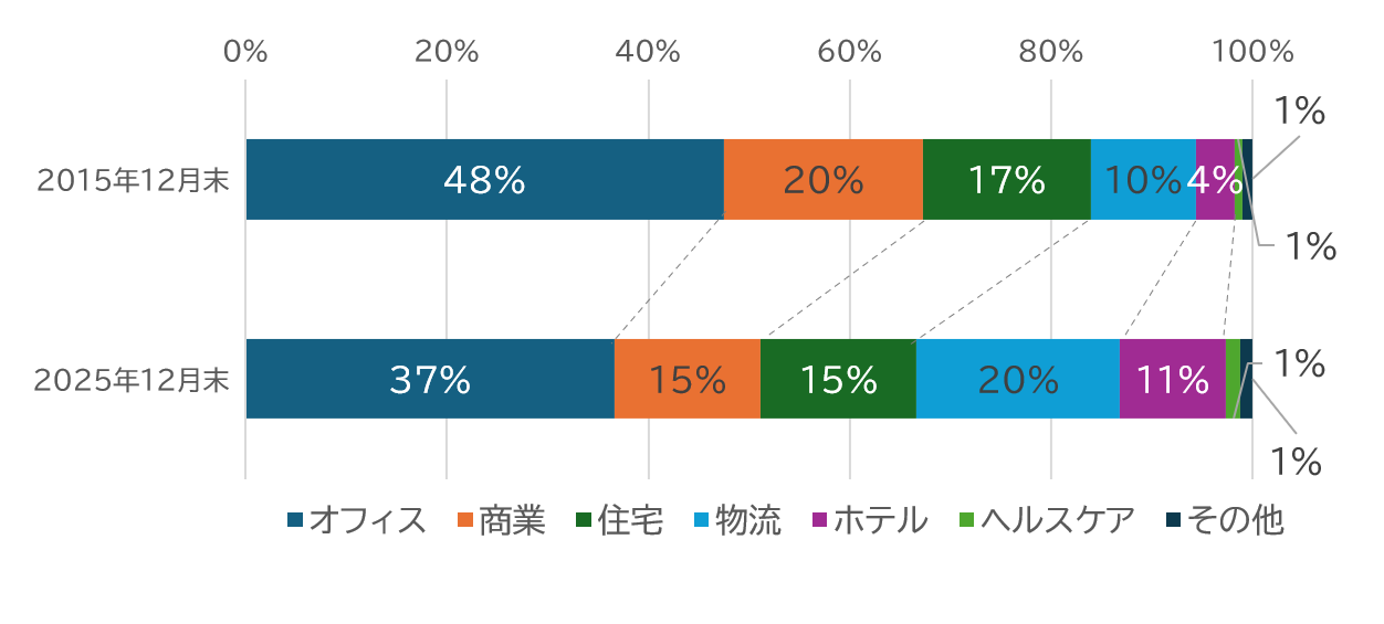 Jリートの保有物件の用途別保有割合の推移(取得価格ベース)