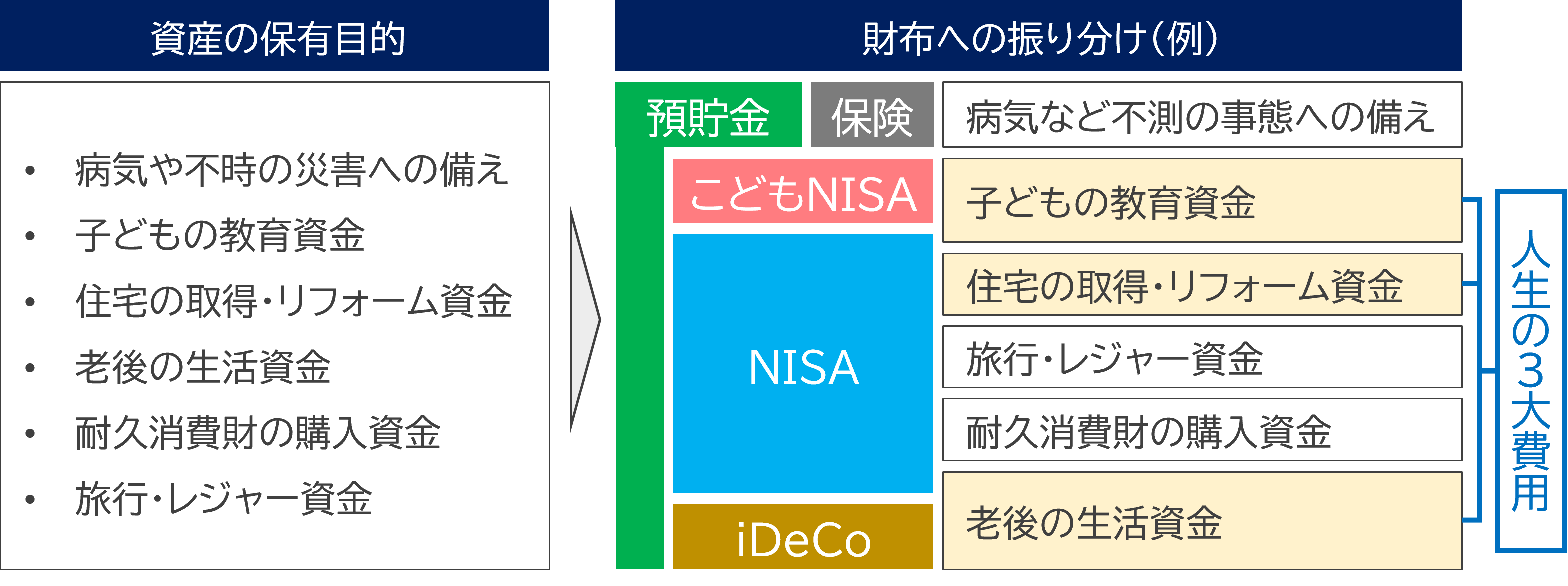 一方、NISAは2024年の拡充によって非課税枠の再利用が可能になり、資金を引き出しやすい仕組みに変更されました。この出し入れの柔軟性によって、「住宅資金」や「旅行・レジャー資金」、「耐久消費財の購入資金」など、必要なタイミングが固定されていないが、大きな費用となるライフイベントに対する資産形成に特に適している財布だと考えられます。