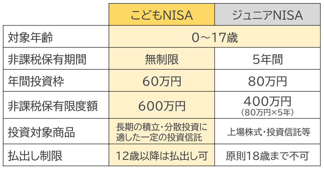 また、「こどもNISA」と2023年に廃止されたジュニアNISAを比較したのが【図表2】です。