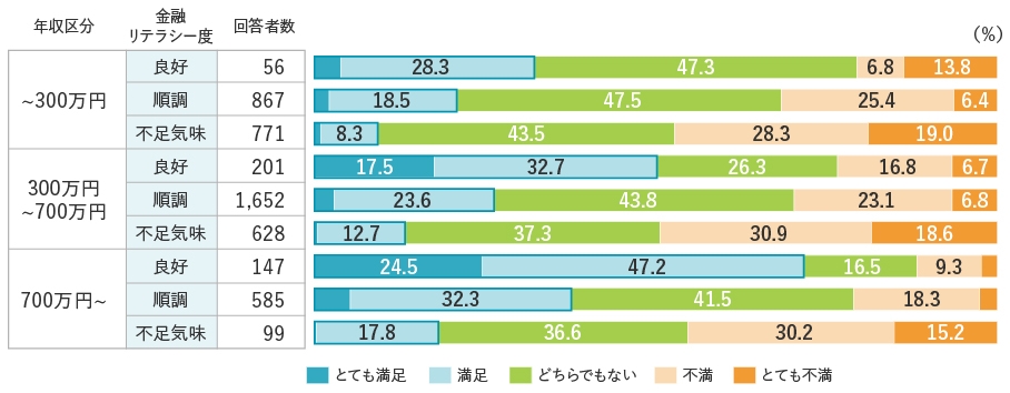 【図表4】年収区分と金融リテラシー度別 会社・団体の報酬水準に対する満足度
