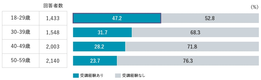 まず、年代別に金融教育の受講経験率を調査した結果を見ると、若年層ほど受講経験率が高いことがわかりました。18~29歳では「47.2%」と、約2人に1人が何らかの金融教育を受けた経験があり、顕著な高さです(図表1)。