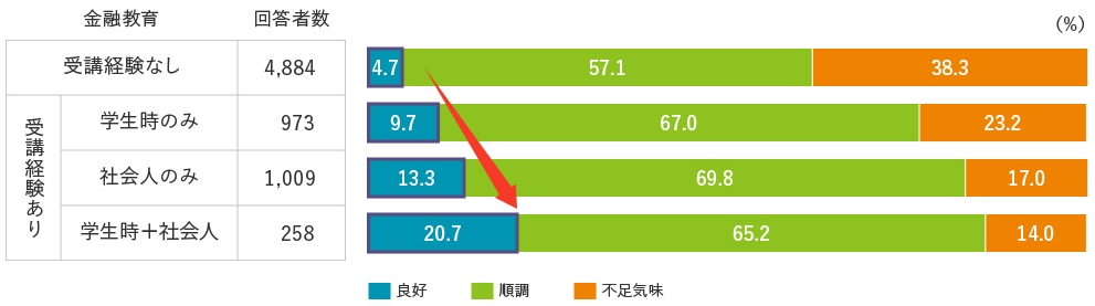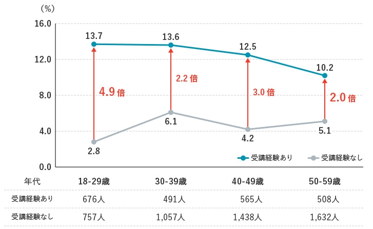 *1:金融教育受講経験:設問「あなたは、これまでに学校や職場においてお金についての授業・教育を受けたことはありますか。受けたことのある時期をすべてお選びください。」に対し、「これまでにそのような授業・教育を受けたことはない」以外の回答をした人