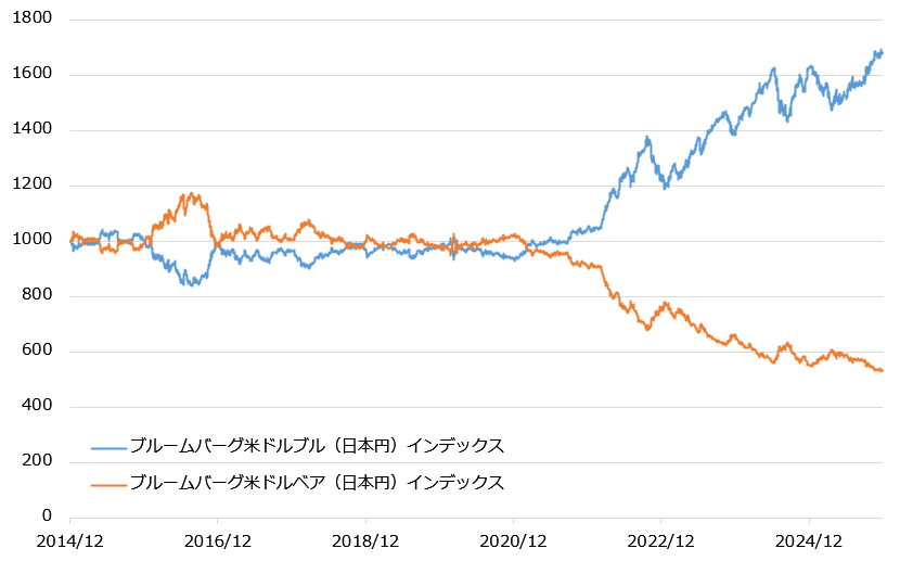| 対象指標の概要 | (1)ブルームバーグ米ドルブル(日本円)インデックスは、日本円に対する米ドルの動きに連動した投資パフォーマンス(円安米ドル高の場合プラスリターン)を捉えることを目的とします。当インデックスは、為替フォワードレートに基づく金利差およびスポット為替変動を反映したリターンと、ブルームバーグ日本短期国債(0-3か月)インデックスのリターンを組み合わせることにより算出されます。2014年12月30日を起算日(1,000ポイント)とし、指数値の算出と公表は日次で行なわれます。 (2)ブルームバーグ米ドルベア(日本円)インデックスは、日本円に対する米ドルの動きに連動した投資パフォーマンス(円高米ドル安の場合プラスリターン)を捉えることを目的とします。当インデックスは、為替フォワードレートに基づく金利差およびスポット為替変動を反映したリターンと、ブルームバーグ日本短期国債(0-3か月)インデックスのリターンを組み合わせることにより算出されます。2014年12月30日を起算日(1,000ポイント)とし、指数値の算出と公表は日次で行なわれます。 |