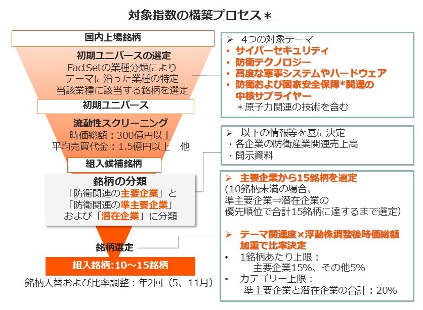 指数の銘柄選定プロセスでは、「サイバーセキュリティ」、「防衛テクノロジー」、「高度な軍事システムやハードウェア」、「防衛および国家安全保障関連の中核サプライヤー」の4つの分野に着目し、関連度の高い銘柄を初期ユニバースとして抽出し、流動性を加味して組入候補銘柄をさらに抽出します。