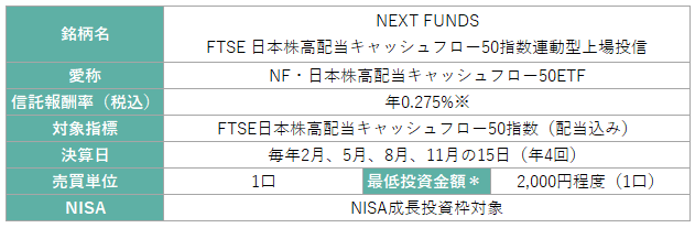 | 銘柄名・コード | NEXT FUNDS FTSE日本株高配当キャッシュフロー50指数連動型上場投信 | ||