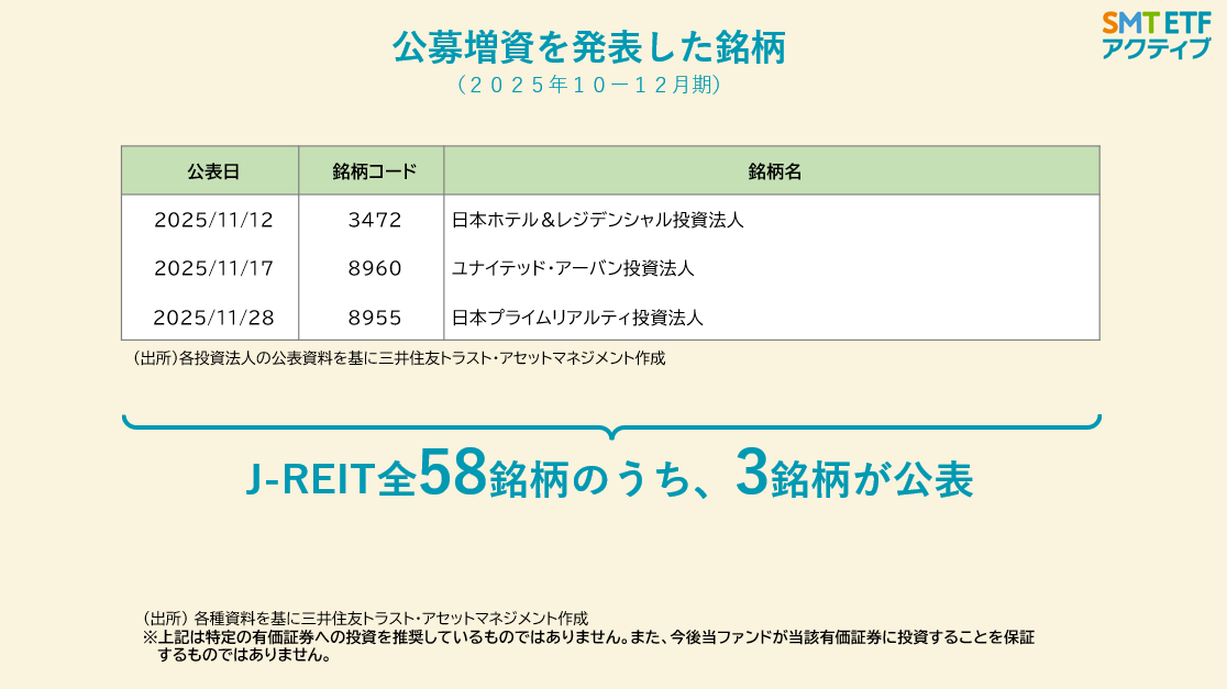 しかし、2025年初以降J-REIT市場が反転する中で、投資口価格が回復する銘柄が増えており、資金調達手段である公募増資に踏み切る銘柄が出てきたのです。