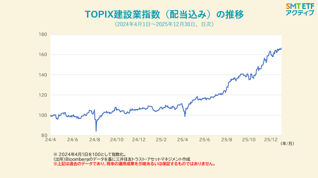 SMT ETF日本好配当株アクティブ(170A)では建設セクターのウェイトを高位に保っていたことが奏功した結果、今期良好なパフォーマンスに繋がり、参考指数であるTOPIX(配当込み)を上回りました。