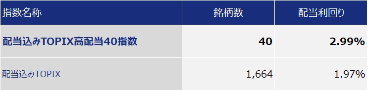 | 対象指標の概要 | TOPIX⾼配当40指数は、TOPIX100の構成銘柄のうち、直近の実績配当利回りが相対的に⾼い40銘柄で構成される時価総額加重方式の株価指数です。 | ||