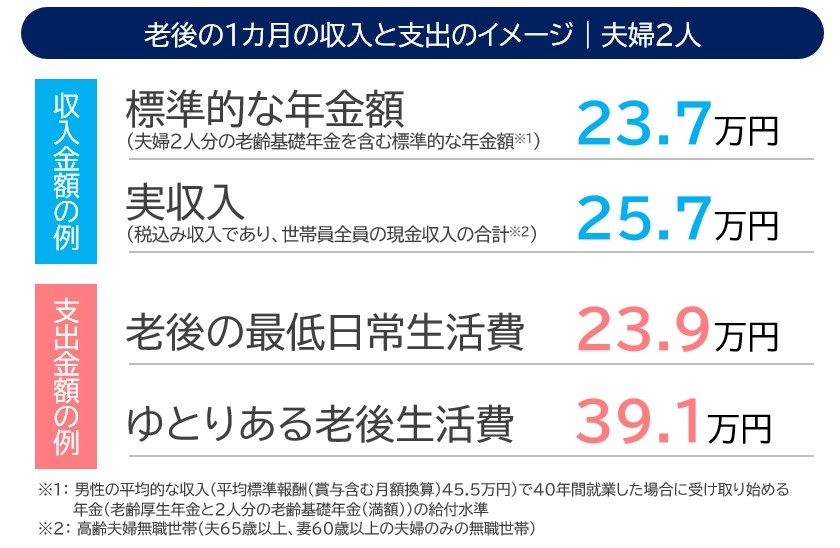 この値を見ると、「老後の最低日常生活費」の23.9万円は「標準的な年金額(23.7万円)」や「実収入(25.7万円)」とだいたい同程度の金額であり、これらの収入の例では最低限の日常生活はまかなえる計算になります。
