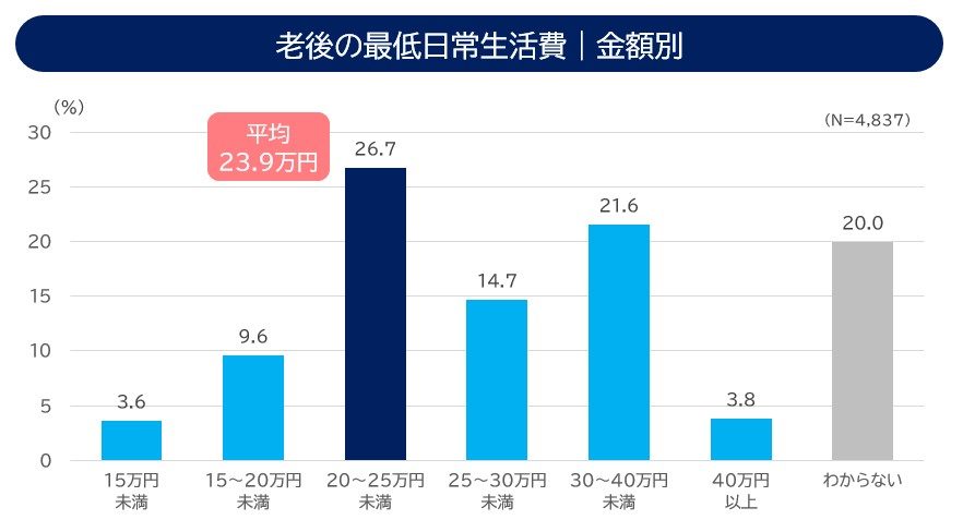 「老後の最低日常生活費」の平均値である23.9万円は、人々のイメージする金額とそれほど離れていない金額と言えそうです。