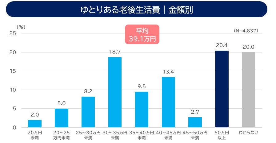 一方、「ゆとりある老後生活費」はどうでしょうか。【図表3】は「ゆとりある老後生活費」の回答を金額の区間ごとに表したものです。グラフを見ると、平均値である39.1万円が含まれる「35~40万円未満」はわずか9.5%です。「50万円以上」と回答した割合が20.4%と最も高く、「30~35万円未満」と回答した割合が18.7%と、かなりばらつきの大きい回答結果だったことが分かります。