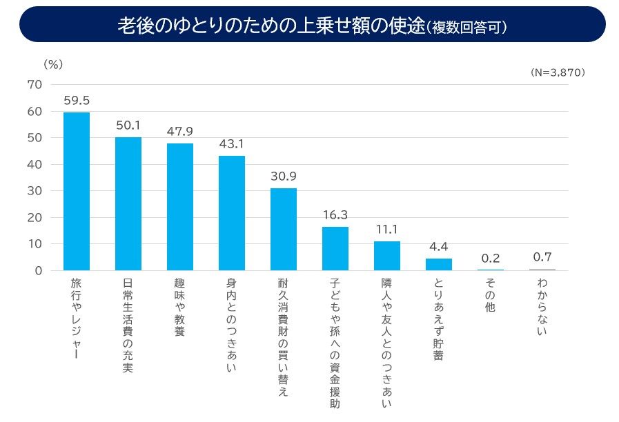 なお、「老後の最低日常生活費」に対して、「ゆとりのある老後生活を送るために必要な上乗せ額の使いみち」を示したものが【図表4】です。「旅行やレジャー」、「日常生活費の充実」、「趣味や教養」といった使いみちが上位に並んでいますが、使いみちとして考える内容によって老後に必要な金額は大きく変わってくると考えられます。