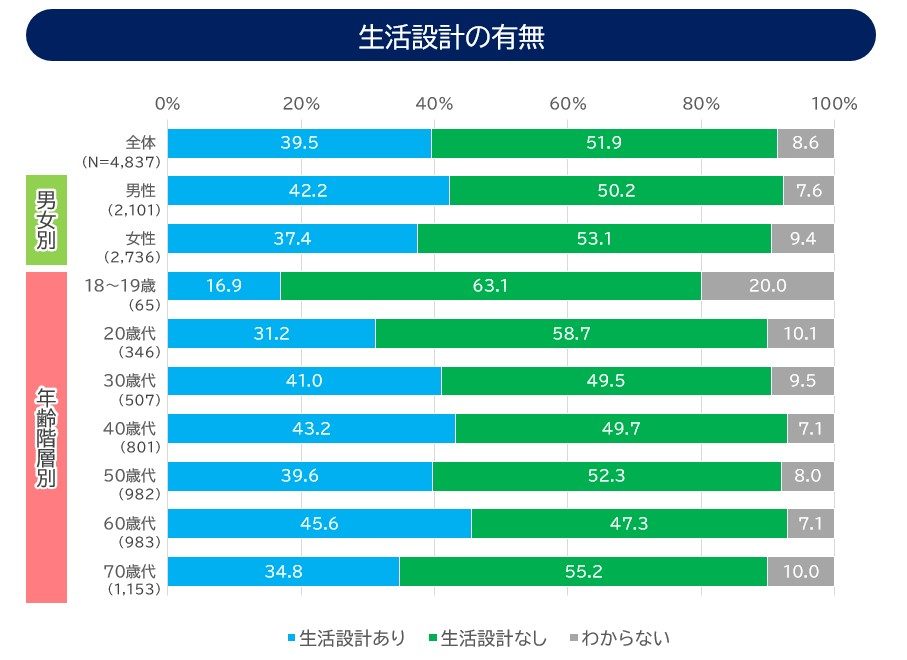 また、生活設計(自分や家族の将来をどのようにしたいか、そのための経済的な準備をどうしたらよいか)を立てている人は少数派でした。【図表6】は具体的な生活設計を立てているかどうかを示したものです。「わからない」も含めると6割の人が生活設計を立てていないと回答しています。老後に向けたお金の具体的な目標や計画ができていない人が多いと考えられます。