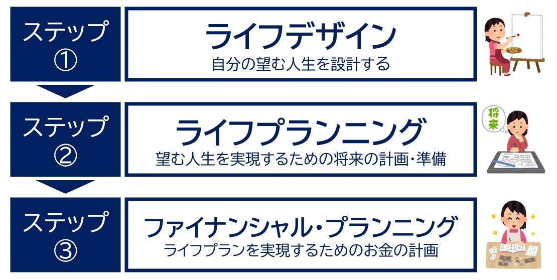 「見える化」のステップは「1.ライフデザイン」、「2.ライフプランニング」、「3.ファイナンシャル・プランニング」の順で見える化していくことと言われています。