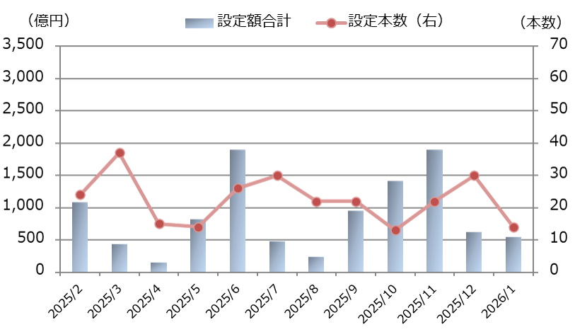 新規設定ファンドのうち、設定額が最も多かったのは「あおぞら・新グローバル分散ファンド(限定追加型)2026-01」(あおぞら、約300億円)であり、次いで2位は「あおぞら・新グローバル・プレミアム・ファンド(当初漸増期間付、限定追加型)2026-01」(あおぞら、約82億円)、3位は「インターナショナル・オポチュニティ・ファンド(ヘッジなし)」(AM-One、約61億円)、4位は「楽天・ゴールド・ファンド(ヘッジなし)」(楽天、約51億円)となった。
