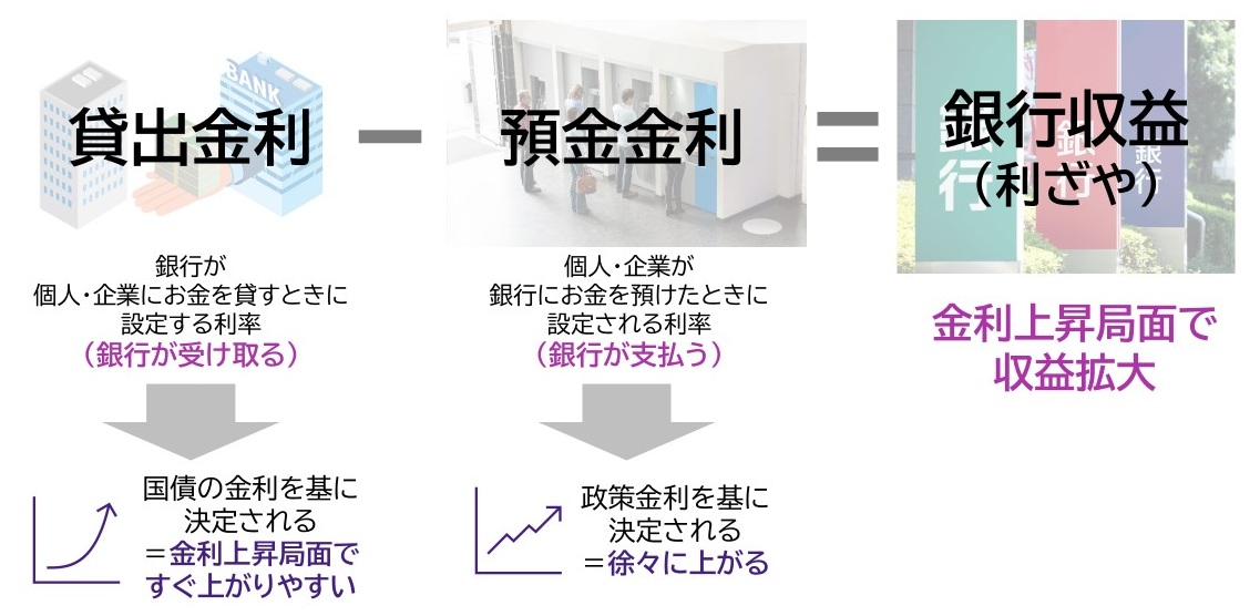 銀行に対する利上げの影響についてより詳しく見てみますと、銀行は貸出金利(銀行が個人・法人にお金を貸すときに銀行が受けとる利率)から、預金金利(銀行が個人・法人にお金を預けるときに銀行が払う利率)を引いた価格差(利ざや)を収益の一つとしています。貸出金利は金利上昇局面ですぐ上がりやすい一方で、預金金利は徐々に上がります。そのため、金利上昇局面では貸出金利の上り幅の方が預金金利の上昇幅より大きいため、銀行の収益が拡大するという仕組みです。