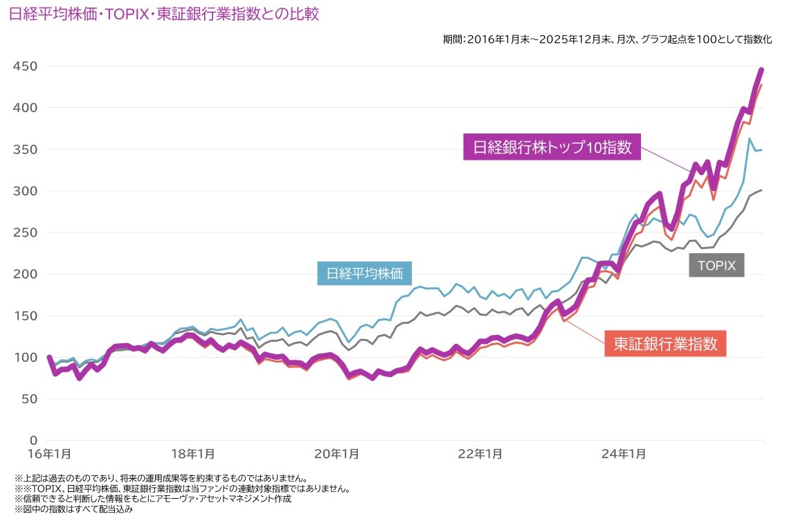 | 対象指標の概要 | 本指数は東京証券取引所プライム市場に上場する銀行の時価総額上位10銘柄で構成される時価総額ウエート方式の株価指数です。なお、各銘柄のウエートは35 %に制限しています。 年一回、定期見直しを実施し、11月末に銘柄の入れ替えを行います。算出開始日は2026年2月2日であり、2010年11月末を基点(10,000)として遡及算出しています。 |