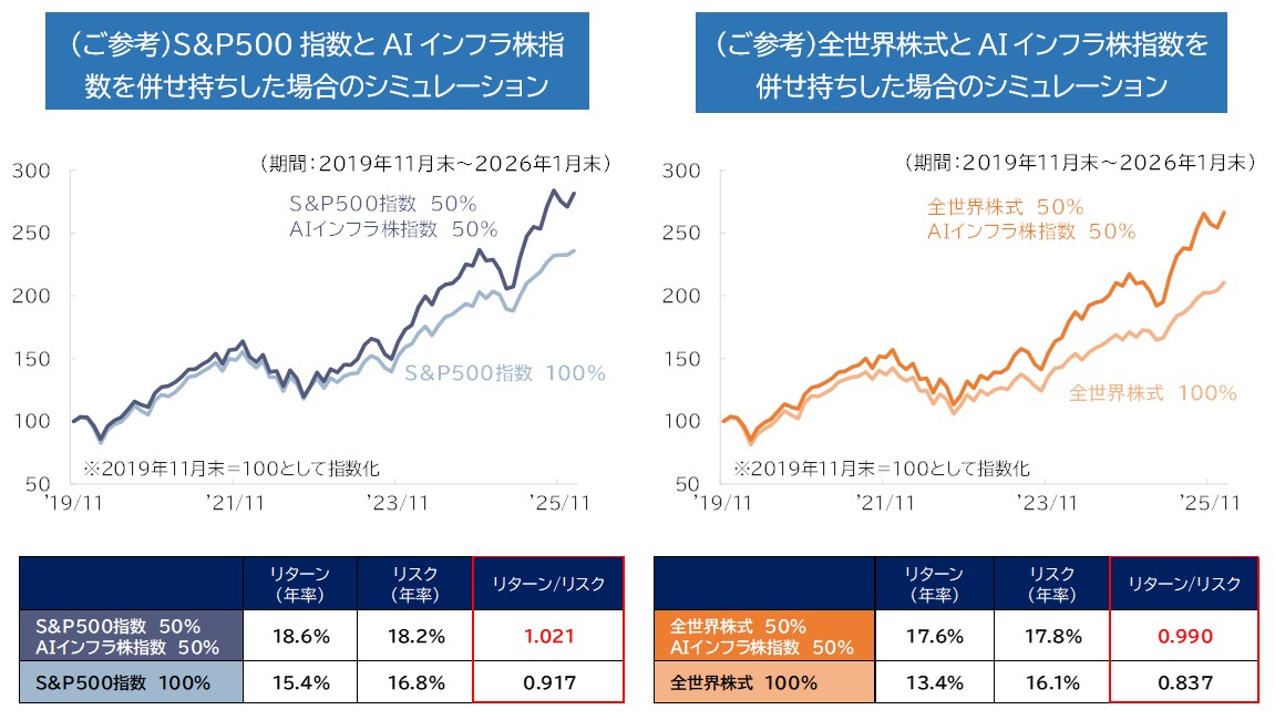 S&P500指数、全世界株式それぞれの指数のみに投資したと仮定した場合と比較して、AIインフラ株指数を併せ持ちすることで、2019年11月末から2026年1月末の期間においては、リスクは上昇したものの運用の効率性も向上しました。なお、運用の効率性とは、リターンをリスクで割ったリスク調整後のリターンで、その数値が高いほど負ったリスクに対して相対的に高いリターンをあげたことを意味しています。