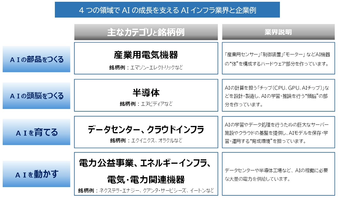 AIを動かす土台であるインフラを担う具体的な企業を、4つの領域に分類してご紹介します。