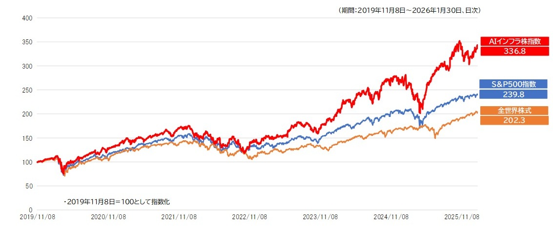 2026年1月30日時点でAIインフラ株指数はS&P500指数、全世界株式を上回りました。