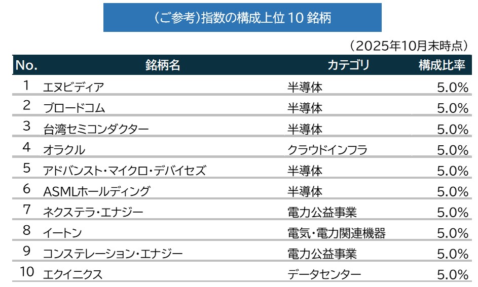 ・当図表はカテゴリと2025年10月末時点の指数構成銘柄を基に記載した一例です。したがって、個別銘柄の推奨を目的とするものではなく、当ファンドにおいて上記銘柄を組み入れることを保証するものではありません。